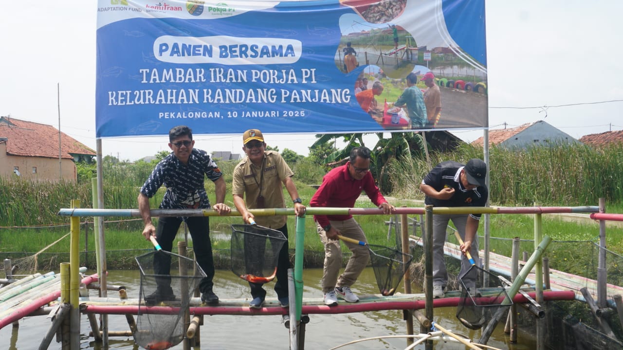 PEKALONGAN, mediapekalongan.com – Selain membantu penanganan secara infrastruktur, Lembaga Kemitraan Indonesia melakukan pemberdayaan masyarakat di 8 kelurahan di Kota Pekalongan yang menjadi sasaran Program Adaptation Fund (AF), salah satunya di Kelurahan Kandang Panjang, Kecamatan Pekalongan Utara. Di wilayah ini, lahan eks bengkok yang sempat bertahun-tahun tergenang air banjir dan rob dioptimalkan kembali untuk budidaya ikan nila. Budidaya ikan nila ini sudah diinisiasi sejak 1 Juni 2024 oleh Kelompok Kerja Perubahan Iklim (Pokja PI) Kelurahan Kandang Panjang dengan jumlah penebaran bibit ikan nila sebanyak 3.450 ekor. Hingga kini sudah bisa membuahkan hasil panen sebanyak tiga kali pada Jumat (10/1/2025).