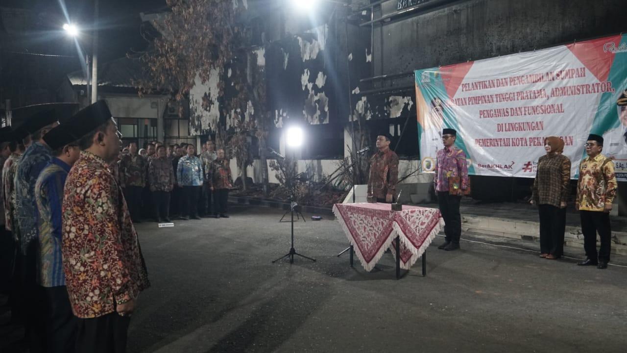 PEKALONGAN, mediapekalongan.com – Suasana pelantikan pejabat di lingkungan Pemerintah Kota Pekalongan, Senin 22 September 2025 malam, terasa berbeda dari biasanya. Jika pada umumnya acara dilangsungkan di Hall Ruang Jlamprang Setda, kali ini Wali Kota Pekalongan, HA Afzan Arslan Djunaid atau yang akrab disapa Aaf, memilih halaman Setda yang masih dipenuhi puing-puing bangunan pascaaksi anarkis pada 30 Agustus lalu sebagai lokasi prosesi pelantikan. Turut hadir Wakil Wali Kota Pekalongan, Hj Balgis Diab dan Sekretaris Daerah Kota Pekalongan, Nur Priyantomo.